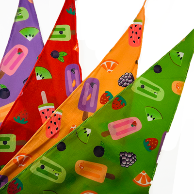 72 assorted edge-finished bandanas. 24 small, 24 medium, 12 large, 12 extra large per bag.