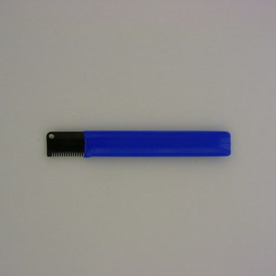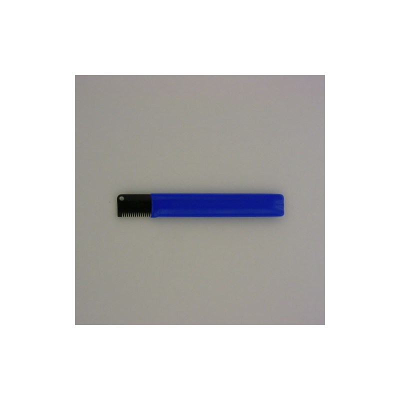 The Xylo stripping knife is especially designed for the professional groomer. Made from the finest quality stainless steel and teflon coated to prevent static when in use. The shark tooth blades have been heat treated to ensure long life. The handle shape fits the palm of the hand so it is very comfortable and will prevent hand fatigue when used for long periods. The green coarse tooth knife is great for the body and legs