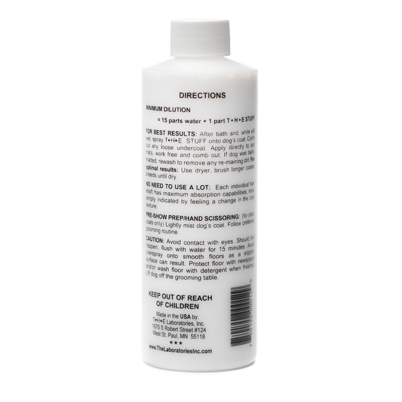 Originally formulated for and a favorite among professional groomers and exhibitors, The Stuff repels dirt, dust, and urine to protect the coat & keep it cleaner longer. It conditions the coat, penetrates mats and tangles for a time saving comb-out, helps when hand scissoring and makes the biannual deshedding ritual a breeze. Hypo-allergenic, non-toxic & pH balanced. Dilutes 15 to 1.