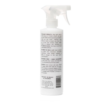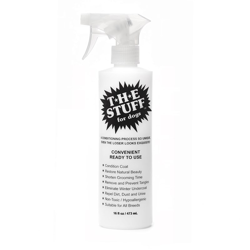 Originally formulated for and a favorite among professional groomers and exhibitors, The Stuff repels dirt, dust, and urine to protect the coat & keep it cleaner longer. It conditions the coat, penetrates mats and tangles for a time saving comb-out, helps when hand scissoring and makes the biannual deshedding ritual a breeze. Hypo-allergenic, non-toxic & pH balanced.